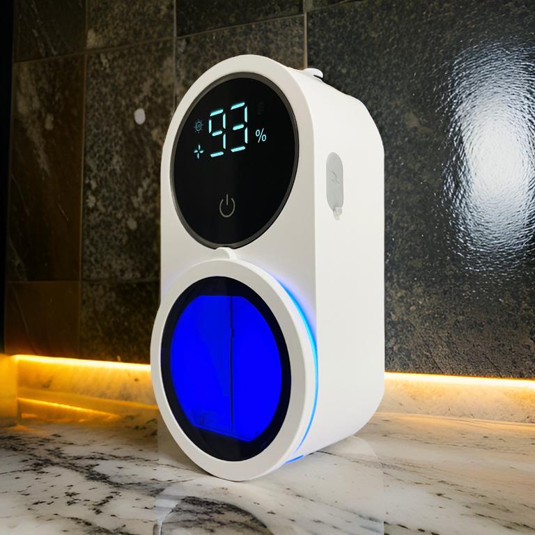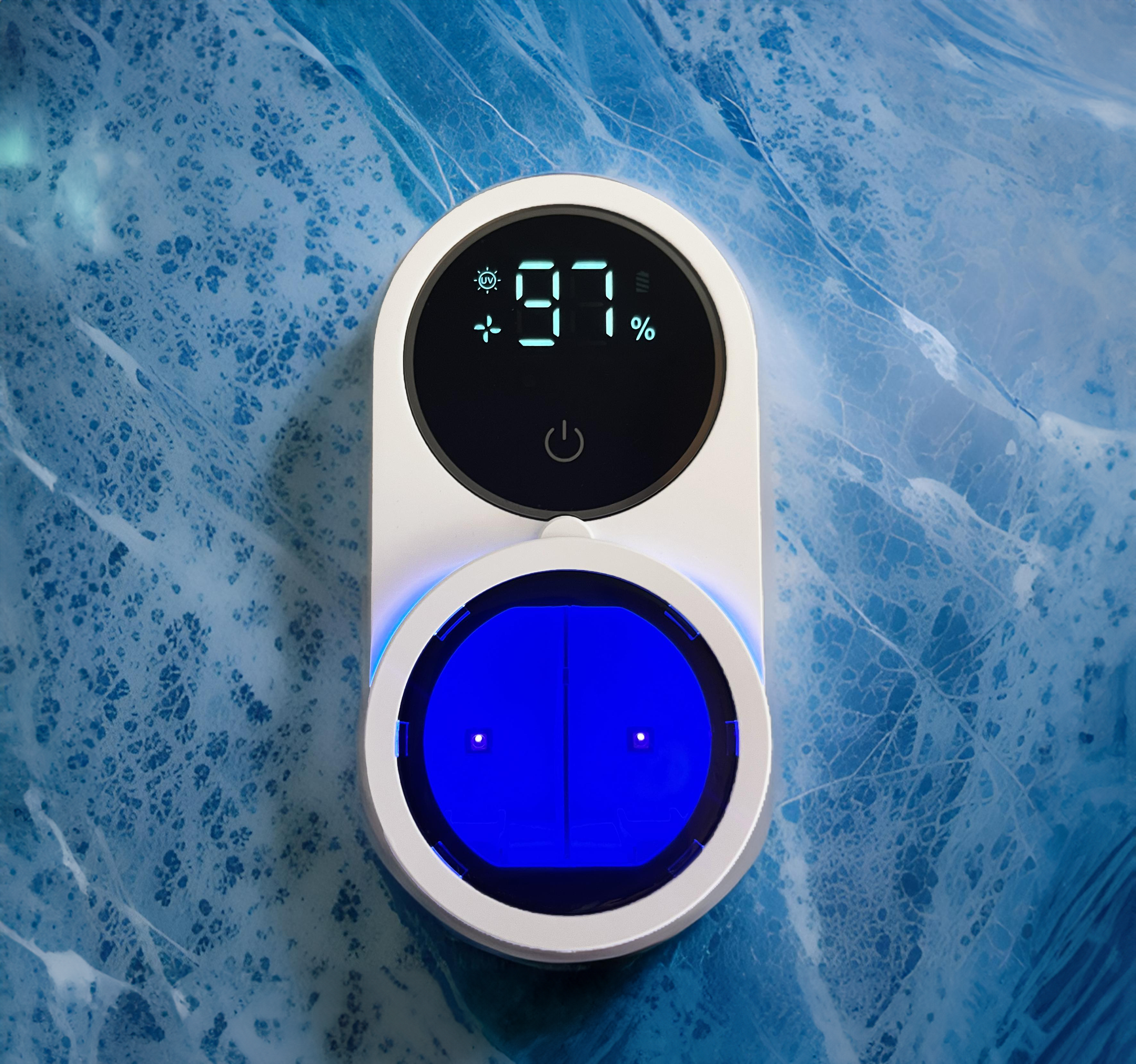 Indicador de Progreso: Proceso completo de desinfección cada 3 horas, con carga USB tipo C y fácil instalación en la pared.